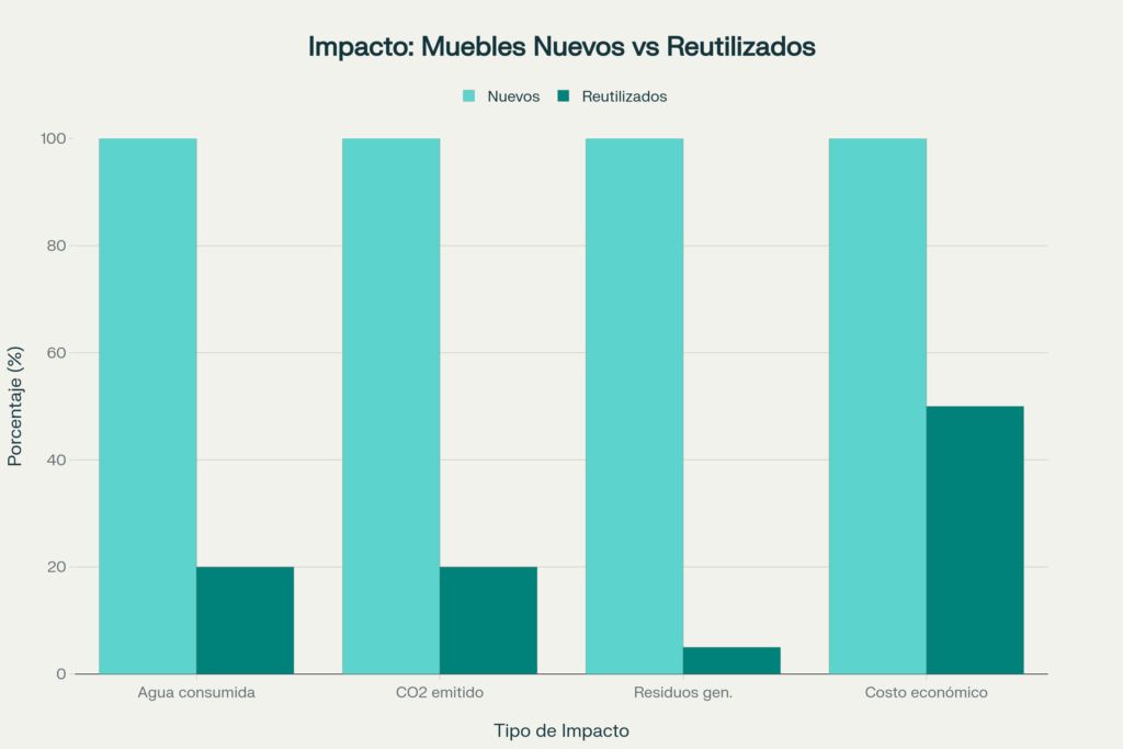 Compara el impacto ambiental entre la compra de muebles nuevos y la reutilización de mobiliario existente. Mira los beneficios de la economía circular: